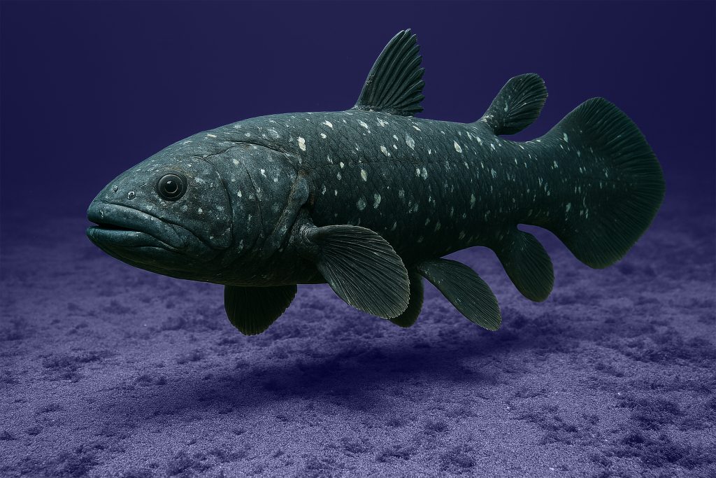 Coelacanths are an ancient group of lobe-finned fish (Sarcopterygii) in the class Actinistia. As sarcopterygians, they are more closely related to lungfish and tetrapods (the terrestrial vertebrates including living amphibians, reptiles, birds and mammals) than to ray-finned fish. The name coelacanth originates from the Permian genus Coelacanthus, which was the first scientifically named genus of coelacanths (in 1839), becoming the type genus of Coelacanthiformes as other species were discovered and named. Well-represented in freshwater and marine deposits from as early as the Devonian period (more than 410 million years ago), they were thought to have become extinct in the Late Cretaceous, around 66 million years ago. On the 17th January 1987 Munich biology student Olaf Reinicke was the first to discover a coelacanth in its natural habitat at a depth of 198 meters. We celebrate this day with an AI image of a Coelacanth…